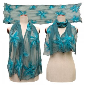 Leichter, petrolfarbener Seidenschal mit stilisierten Blüten in Türkistönen.