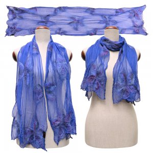 Das Muster aus feiner Schurwolle wurde in die Seidenbasis aus Chiffon eingearbeitet (Nuno-Technik). Die Ränder des Schals sind rolliert.