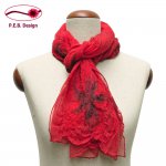 Leichter Seidenschal in Rot mit stilisierten Blüten in Schwarz- und Rottönen. Handgefärbte schwarze Maulbeerseidenfasern betonen die zarten Blüten und setzen Glanzpunkte. Das Muster aus feiner Schurwolle und Maulbeerseidenfasern wurde in die Seidenbasis aus Chiffon eingearbeitet (Nuno-Technik). Die Ränder des Schals sind rolliert. Ein hübsches Accessoire, das sowohl drinnen als auch draußen oder als Haartuch getragen werden kann.
