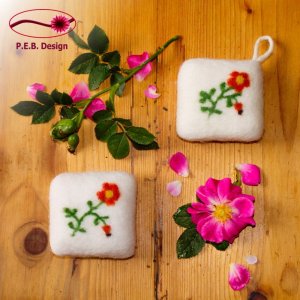 Umfilzte Wildrosen-Seife mit Blütenmotiv auf der Vorderseite. Die weiche Wolle von Südtiroler Bergschafen sorgt für einen angenehmen Peeling- und Massageeffekt auf der Haut. Zusätzlich schäumt die Seife durch die Filzhülle sehr fein auf; ist daher also bis zu viermal länger haltbar als herkömmliche Seifen und kann restlos aufgebraucht werden. Unter dem Filzmantel verbirgt sich eine französische Pflanzenölseife der Firma Savon du Midi mit beigegebener Sheabutter (Karitébutter), feinen Pflanzenteilen und angenehm mildem Rosenduft. Die zur Seifenherstellung verwendeten pflanzlichen Bestandteile stammen aus kontrolliert biologischem Anbau. Zur Verwendung unter der Dusche die umfilzte Seife unter warmem Wasser gut befeuchten und in der Hand bewegen, bis sie schäumt. Anschließend abspülen und zum Trocknen aufhängen oder in eine unterlüftete Seifenschale legen. Auch als Duftkissen für den Wäscheschrank geeignet.